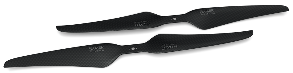 FLUXER 17.5 x 5.5 carbon fiber propellers have been designed exclusively for multirotors. Reduced weight, improved rigidity and redesigned airfoil shape along with balsa and carbon fiber structure of propeller results in excellent efficiency and better responsiveness of propultion system.