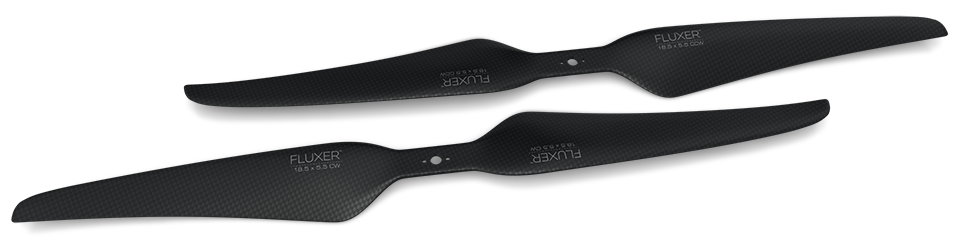 FLUXER 18.5 x 5.5 carbon fiber propellers have been designed exclusively for multirotors. Reduced weight, improved rigidity and redesigned airfoil shape along with balsa and carbon fiber structure of propeller results in excellent efficiency and better responsiveness of propultion system.
